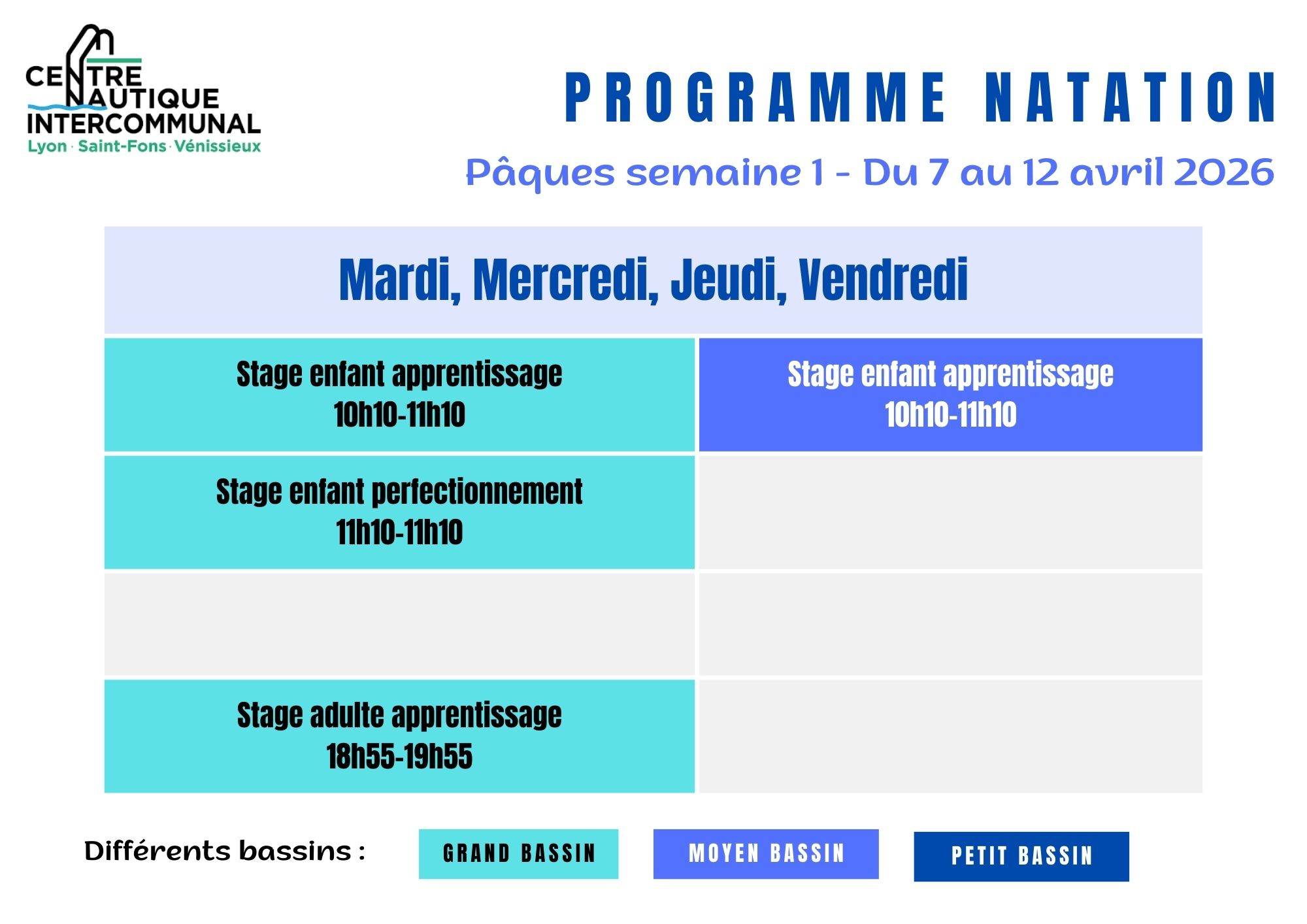 Vacances scolaires : Stages de natation ENFANTS et ADULTES